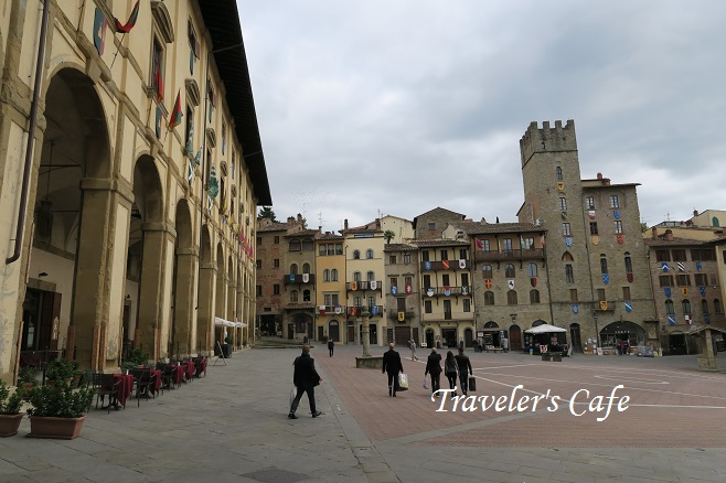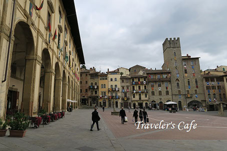 そんなアレッツォも町の中心部はまだ中世の趣を残している。中心となるグランデ広場はゆるやかな坂となっていて、時折伝統行事やマーケットなどが行われている。周囲の建物には各地区の紋章が飾られ、独特な威厳を感じることができる。北側には万能の芸術家、ヴァザーリの設計した宮殿があり、その美しい回廊にはレストランやカフェが店を連ねる。整備された町中は歩きやすく、メーンストリートにはたくさんの店が集まりウィンド・ショッピングも楽しい。