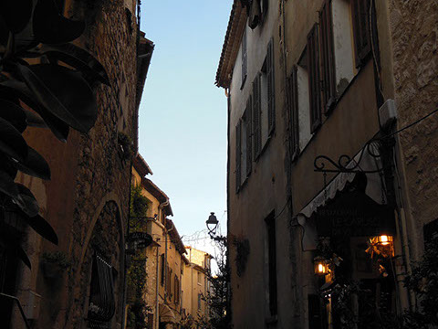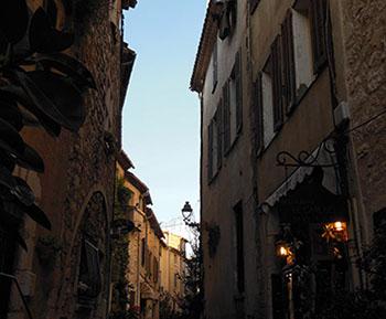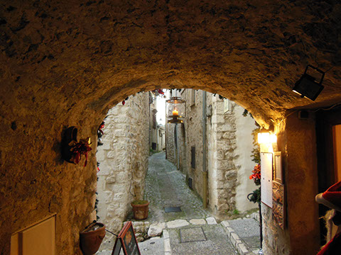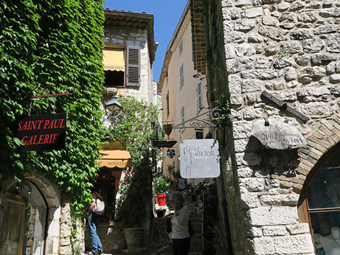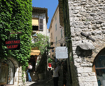 コート・ダ・ジュールの数ある鷲ノ巣村の中でも、ひときは賑やかでおしゃれな村がここサンポール・ドヴァンス。古い街並みや城壁を上手く使いながら美しく整備された小さな村は、まるで町づくりのお手本のよう。緩やかなカーブで形成された路地には凝った形の石畳が敷き詰められ、道の両側にはおしゃれなアトリエやブティックが軒を連ねる。どの店も美しい風景の一部として溶け込んでいて、外に張り出した看板もまるで芸術作品。どこを切り取っても絵になる風景だ。
